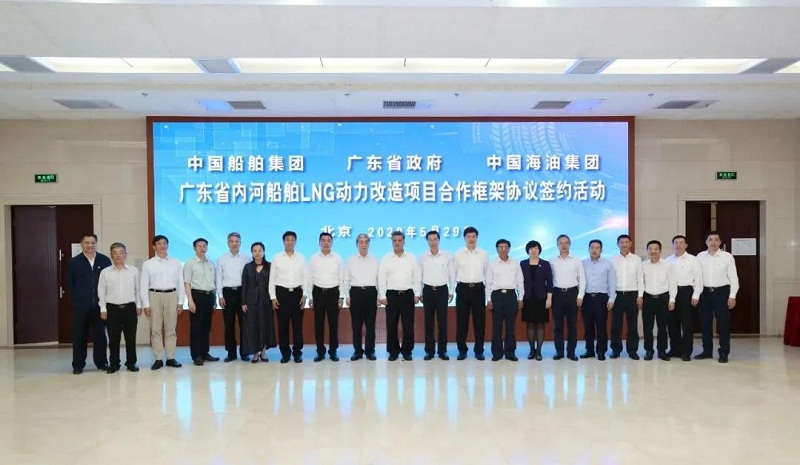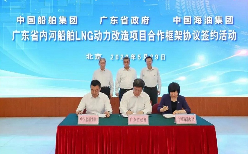????5月29日,中國(guó)船舶集團(tuán)有限公司與廣東省人民政府、中國(guó)海洋石油有限公司在京簽署《廣東省內(nèi)河船舶LNG動(dòng)力改造項(xiàng)目合作框架協(xié)議》。廣東省委副書記、省長(zhǎng)馬興瑞,中國(guó)船舶集團(tuán)黨組書記、董事長(zhǎng)雷凡培,中國(guó)海油黨組書記、董事長(zhǎng)汪東進(jìn),中國(guó)船舶集團(tuán)黨組成員、副總經(jīng)理杜剛,中國(guó)海油黨組成員、副總經(jīng)理陳壁出席簽約儀式。廣東省副省長(zhǎng)覃偉中,中國(guó)船舶集團(tuán)黨組成員、副總經(jīng)理孫偉,中國(guó)海油黨組成員、總會(huì)計(jì)師溫冬芬分別代表各方在協(xié)議上簽字。