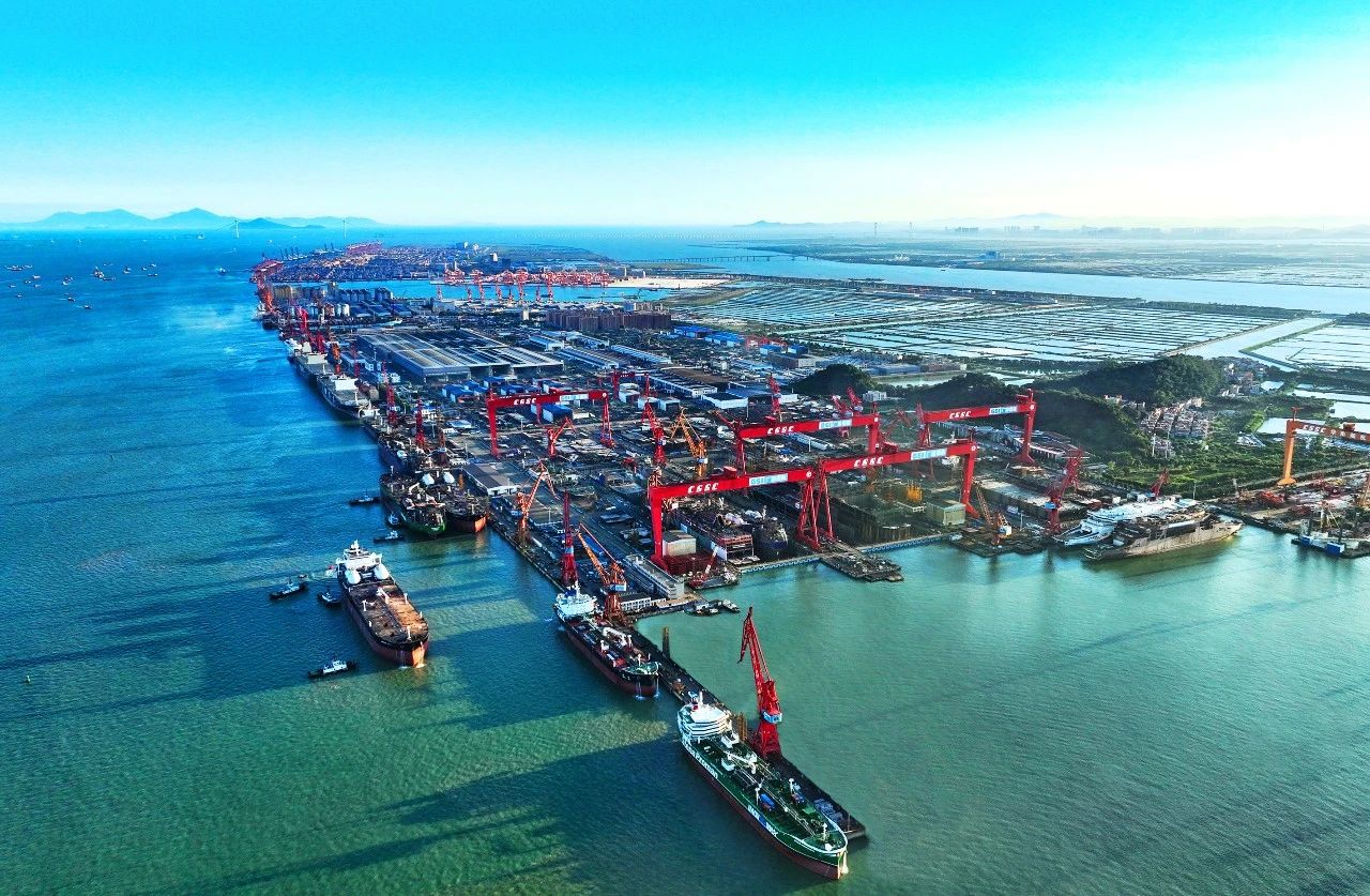落日余暉下,造船現場燈火通明,展現出一派繁忙景象。在五彩斑斕的晚霞襯托下,整個造船基地猶如寶石般熠熠生輝。