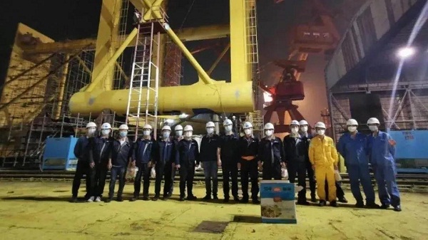 ????同一天,隨著最后一塊防沉平臺箱梁分段順利吊裝,黃埔文沖非船團隊已經連續奮戰十天十夜。至此,為保利長大公司建造的明陽華西單樁穩樁平臺主體工程
