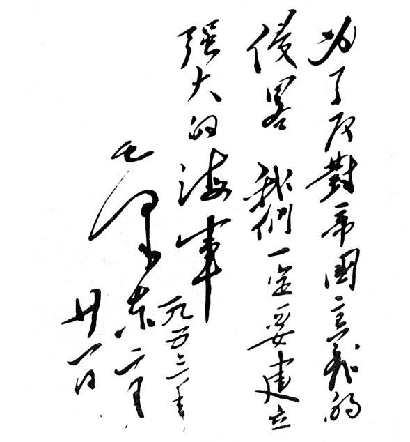 1953年2月19日,毛澤東在武漢登上長江艦視察長江中下游四省,并在長江艦上為海軍題詞:“為了反對帝國主義的侵略,我們一定要建立強大的海軍。”船未行至南京,毛澤東提出要在南京檢閱海軍戰(zhàn)艦。華東海軍立即抽調了“廣州”號和“南昌”號護衛(wèi)艦、“黃河”號登陸艦,以及101號、104號魚雷艇參加檢閱。幾天中,毛澤東連續(xù)5次都寫下同樣的題詞:“為了反對帝國主義的侵略,我們一定要建立強大的海軍”。這是中國領導人對建設強大海軍、建設一流裝備的殷切期望,是新生的中國對建設強大海防的決心。如今這顆刻著偉人囑托的銘石,靜靜矗立在江南造船長興島造船基地行政樓前的草坪,也靜靜地矗立在每一位江南人的心中。
