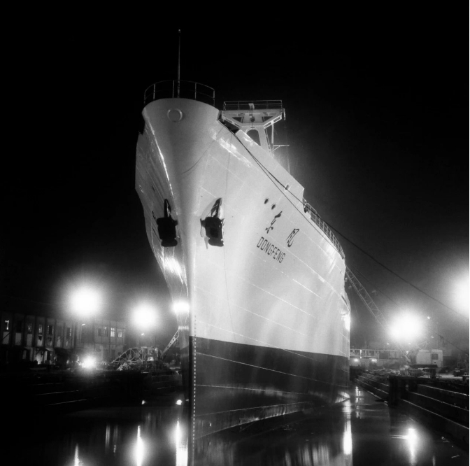 “一五”后期,研制萬噸級遠洋貨船被列為國家新科技規(guī)劃的重點項目。在西方長期封鎖尤其是后來蘇聯(lián)中止援助的困難局勢下,“東風”號是中國人首次嘗試自行設計、自行建造,全部采用國產設備的首艘萬噸遠洋船。1960年4月15日,“東風”號下水,時任上海市委書記陳丕顯、副市長曹荻秋等人出席下水典禮。萬噸輪被命名為“東風”號。
