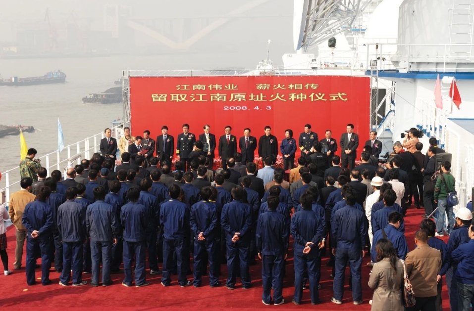 2008年4月,江南造船老廠建造的最后一艘船“遠望6”號航天測量船即將交付。4月3日,時任江南造船搭載部部長黃文飛作為取火者從“遠望6”號船前甲板的上建位置手拿焊槍取火引燃火炬?;鹁嬉来蝹鬟f至勞動模范、三八紅旗手、江南造船領導等,最后傳至時任中船集團總經理陳小津手中并由他點燃了火種盒。6月3日,江南造船人親手建造的船舶特地趕回“娘家”,載著江南“火種”駛往新基地,為新建造的產品開工點火。
